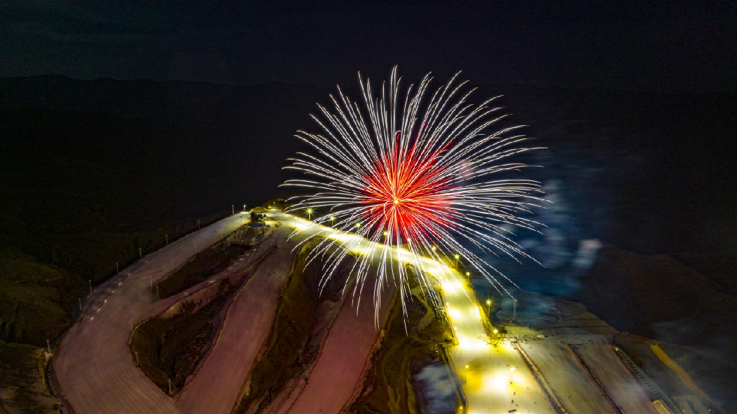 2月5日,馬鬃山滑雪場上演大型雪地?zé)熁ㄐ?,吸引了大量游客觀看。(無人機照片)新華網(wǎng)發(fā)(樂炎 攝)