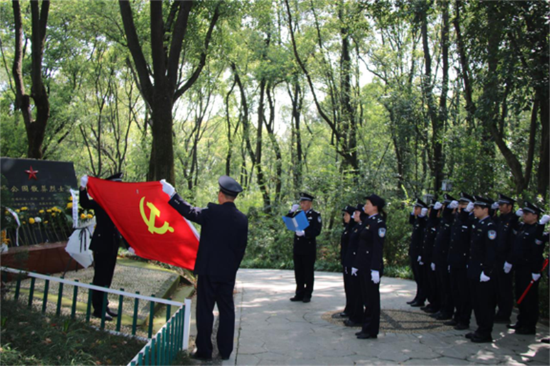 上午10時(shí)許,祭掃儀式開始。全體民輔警整裝列隊(duì),肅立烈士墓碑前,在莊嚴(yán)肅穆的氛圍中,王永生、杜杰同志緩步上前,向烈士墓碑及長眠在此的革命先烈敬獻(xiàn)花籃并為花籃梳理挽聯(lián)。隨后,全體人員脫帽肅立默哀,并向革命烈士敬獻(xiàn)鮮花。最后,面對莊嚴(yán)的黨旗,全體人員舉起右手重溫了入黨誓詞,表達(dá)了對黨的赤誠之心。