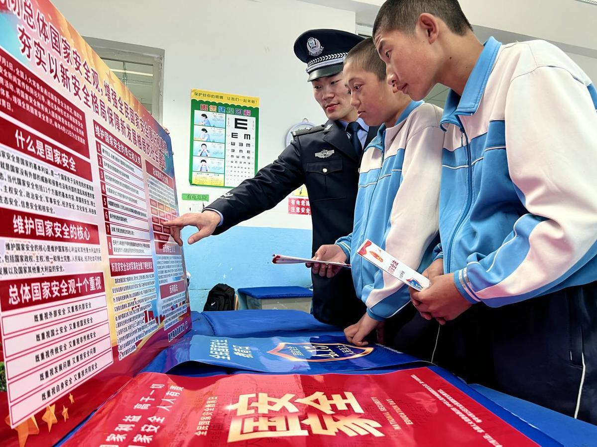圖為2023年4月11日,民警正在利用宣傳展板與宣傳資料開展全民國(guó)家安全教育日授課。