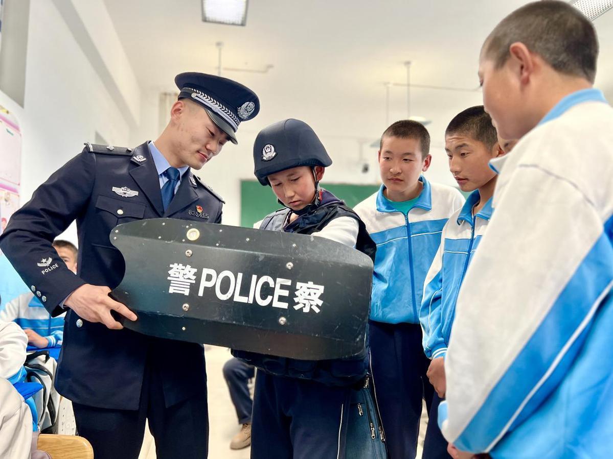 圖為2023年4月11日,民警正在向?qū)W生講解警務(wù)器材。