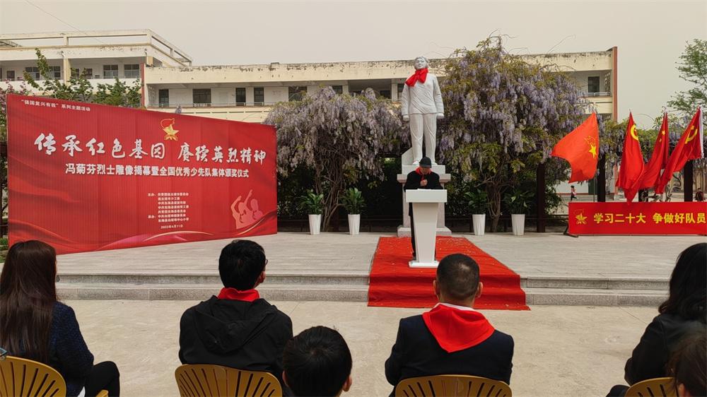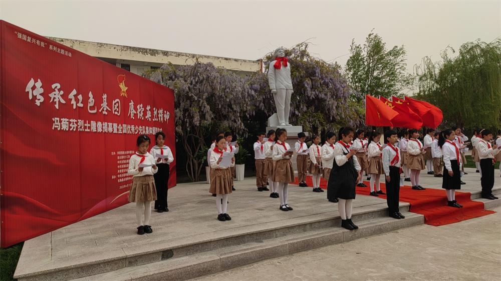 活動現(xiàn)場,出席儀式的幾位領(lǐng)導和少先隊員代表緩緩地為“雨花英烈”之一的馮菊芬烈士塑像揭幕,褪去紅布的烈士塑像在藍天白云下愈顯純潔高大、莊嚴而肅穆。