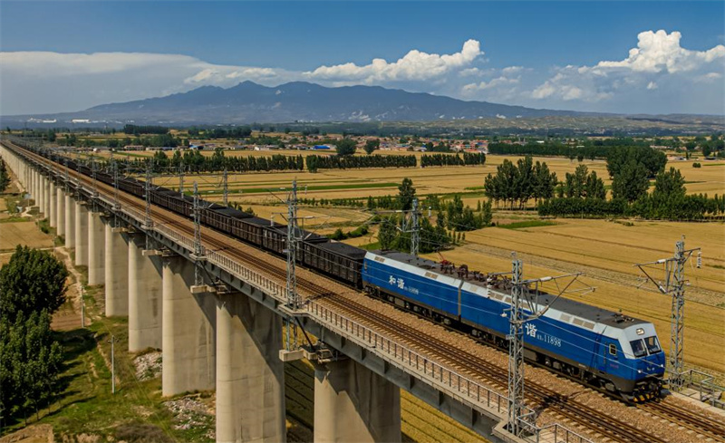 迎峰度夏保障重點(diǎn)物資安全高效運(yùn)輸,一列滿載電煤的重載列車行駛在山西省臨汾綜合段管內(nèi)的師村特大橋下行線上。新華社發(fā)(張睿攝)