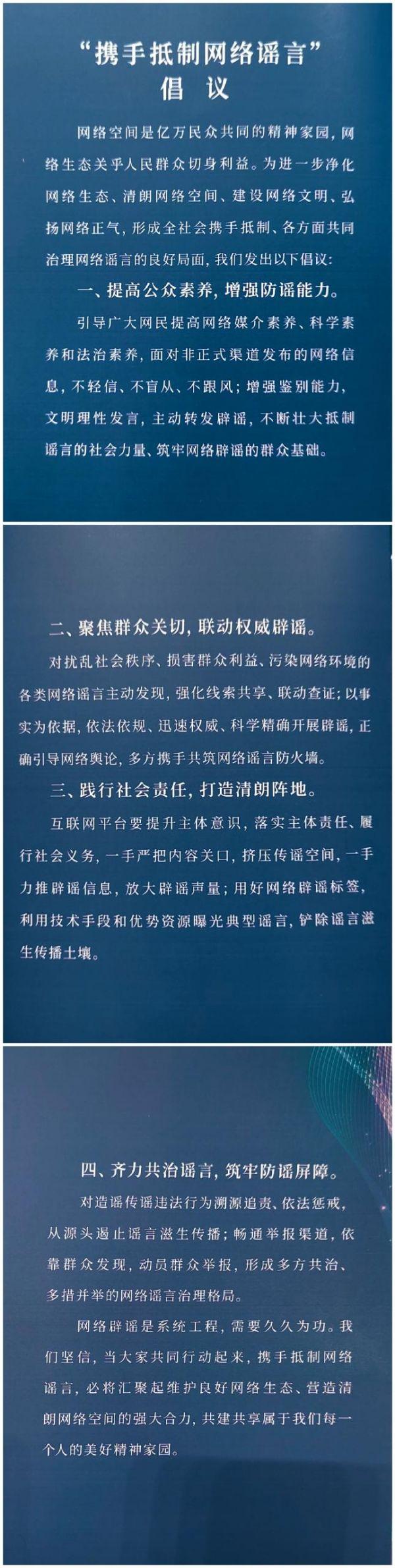 網(wǎng)絡空間是億萬民眾共同的精神家園,網(wǎng)絡生態(tài)關(guān)乎人民群眾切身利益。為進一步凈化網(wǎng)絡生態(tài)、清朗網(wǎng)絡空間、建設(shè)網(wǎng)絡文明、弘揚網(wǎng)絡正氣,形成全社會攜手抵制、各方面共同治理網(wǎng)絡謠言的良好局面,本次論壇發(fā)布了《“攜手抵制網(wǎng)絡謠言”倡議》。