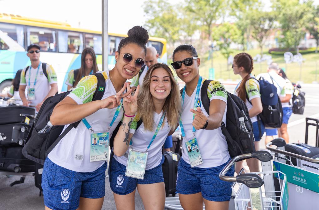 ↑7月22日,巴西代表團(tuán)成員抵達(dá)成都大運(yùn)村后合影。