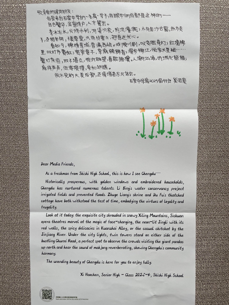 ↑圖為四川省成都市石室中學(xué)高2025屆4班奚浩宸親筆書(shū)寫(xiě)的信件。