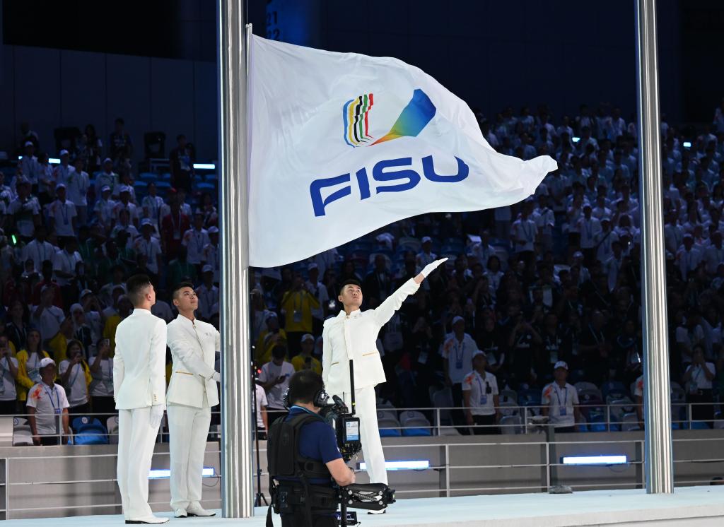 7月28日,國際大學(xué)生體育聯(lián)合會會旗在開幕式上升起。新華社記者胥冰潔攝