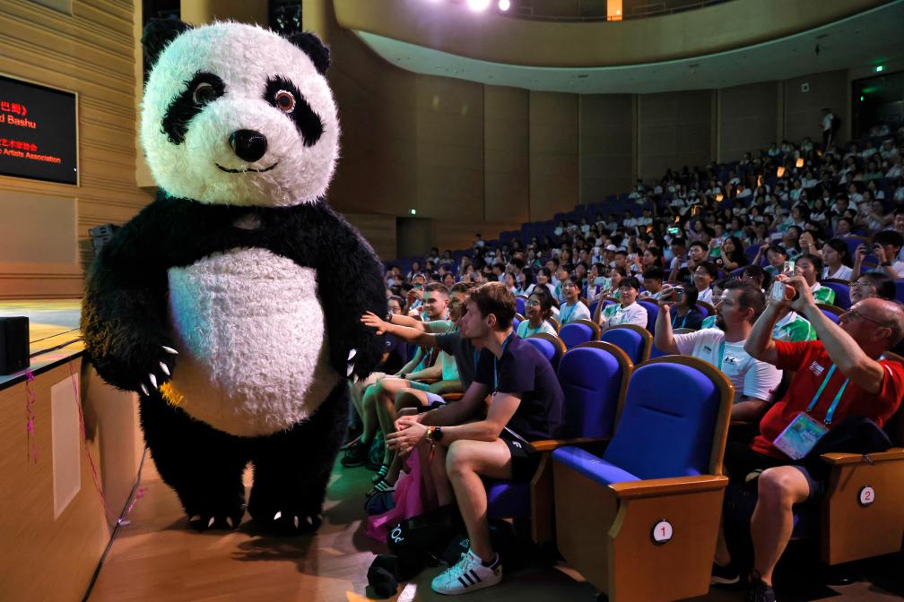 8月2日,一名演員裝扮成大熊貓?jiān)谘莩鲩g隙與觀眾互動(dòng)。當(dāng)日,“奇幻之夜”雜技魔術(shù)晚會(huì)在成都大運(yùn)村藝術(shù)中心大劇場舉行。本場活動(dòng)是在大運(yùn)村舉辦的“Be Together”主題系列晚會(huì)之一。新華社記者沈伯韓攝