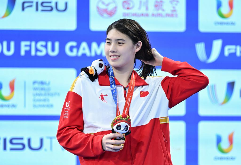 8月2日,張雨霏在女子50米蝶泳頒獎(jiǎng)儀式上。新華社記者陳澤國攝