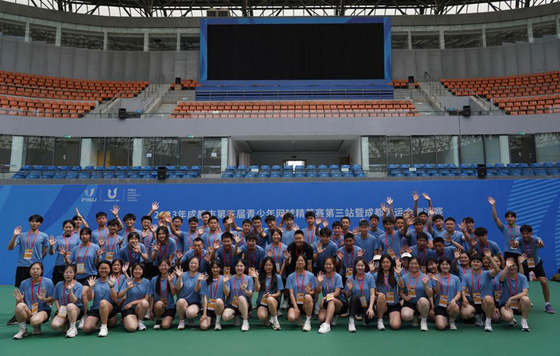 參與服務(wù)成都大運會網(wǎng)球賽事的志愿者在此前的測試賽中合影留念