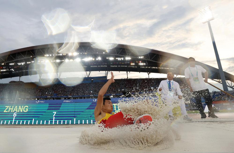 8月6日,張景強(qiáng)(左)在比賽中。當(dāng)日,在成都大運(yùn)會(huì)男子跳遠(yuǎn)決賽中,他以7米93的成績(jī)獲得金牌。新華社記者 賈浩成 攝