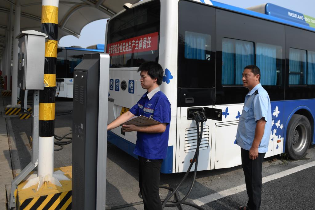 工作人員(左)在杭州公交電車公司拱康路維保站檢查純電動(dòng)公交車的充電情況。新華社記者黃宗治 攝