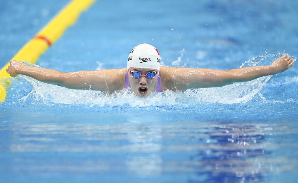 9月24日,中國(guó)隊(duì)選手張雨霏在女子200米蝶泳決賽中以2分05秒57破賽會(huì)紀(jì)錄的成績(jī)奪冠。