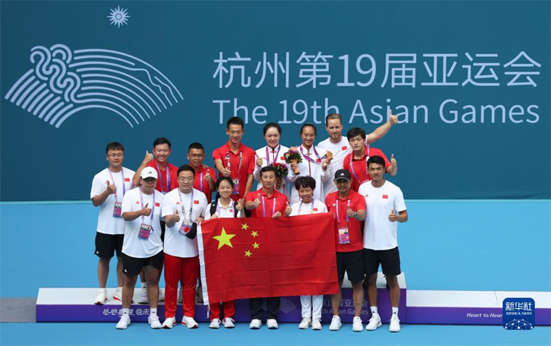 9月29日,中國(guó)網(wǎng)球隊(duì)成員在頒獎(jiǎng)儀式后合影。