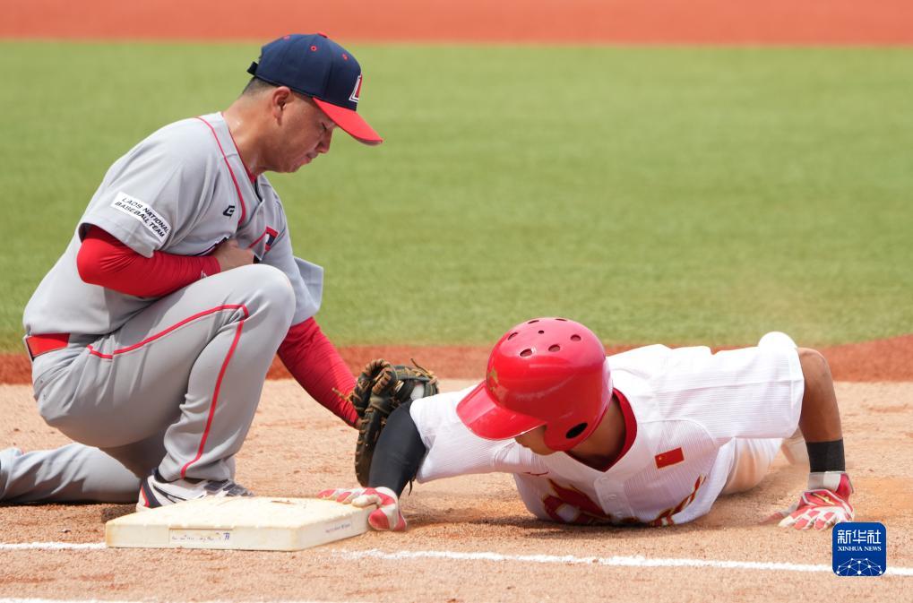 10月1日,中國隊(duì)球員梁培(右)在比賽中搶壘。