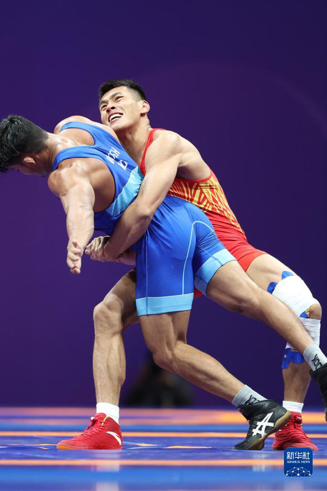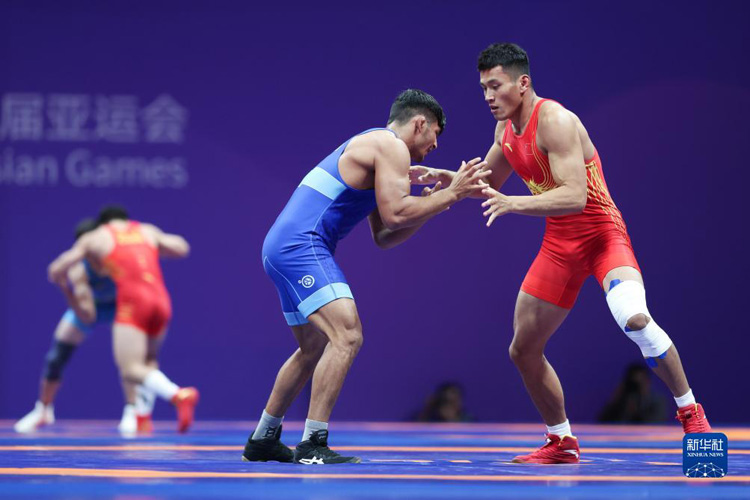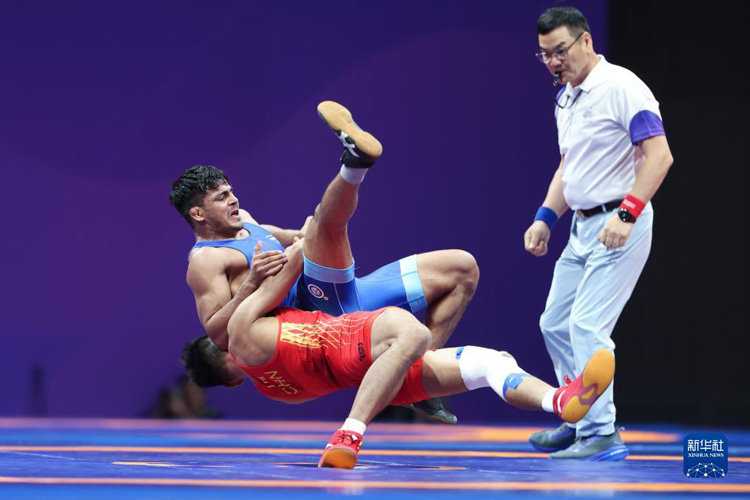 當(dāng)日,在杭州亞運(yùn)會(huì)摔跤項(xiàng)目男子古典式77公斤級(jí)四分之一決賽中,中國選手劉瑞戰(zhàn)勝印度選手維卡斯,晉級(jí)半決賽。