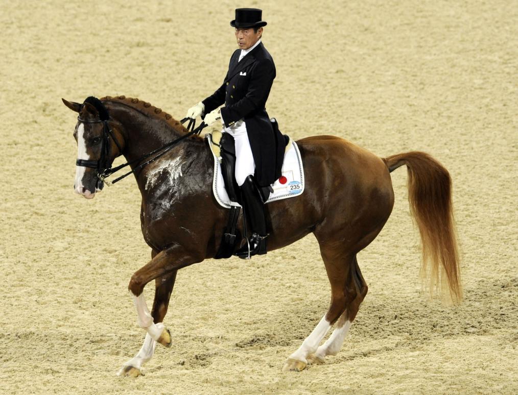 2008年8月14日,時年67歲的日本騎手法華津?qū)捲诒本W運會比賽中。新華社記者呂小煒攝