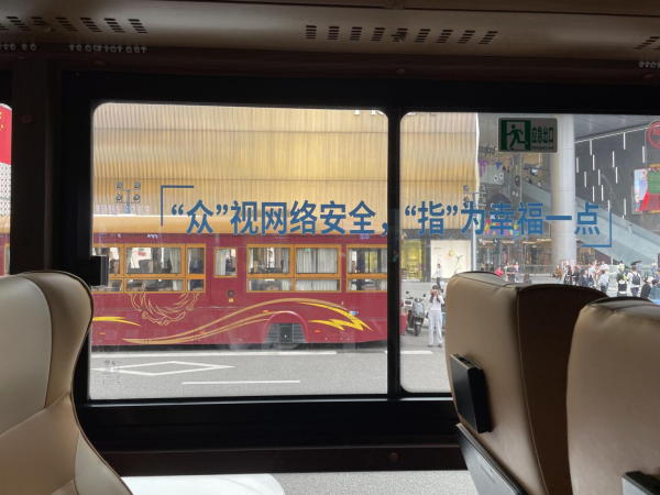 在網絡普法公交的車窗上,也“隱藏”著網絡普法金句——“眾”視網絡安全,“指”為幸福一點!隨著車輛在大街小巷間穿梭,沉浸式學法帶給每位乘客全新的體驗,普法真正“動”了起來。