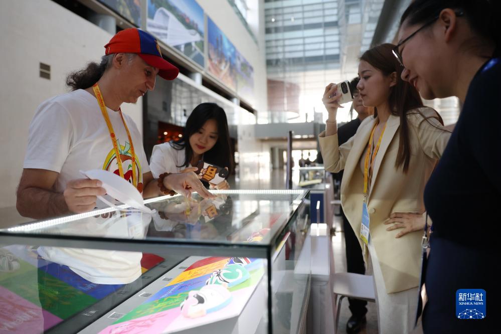 10月16日,參會記者在“一帶一路”國際合作高峰論壇新聞中心參觀展示的中國非物質文化遺產展品。