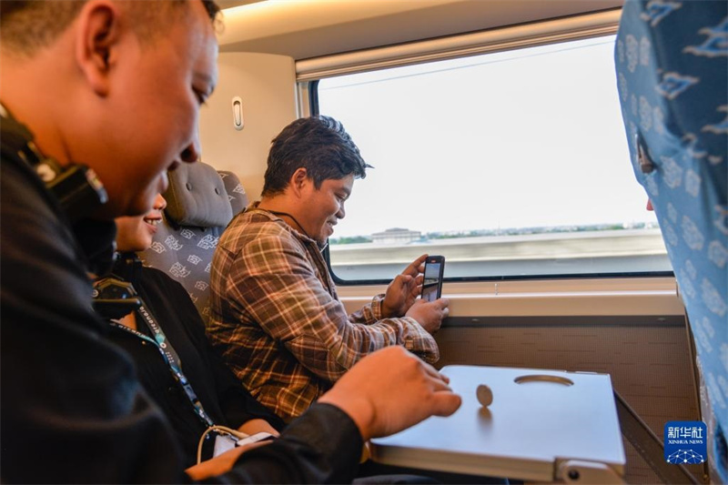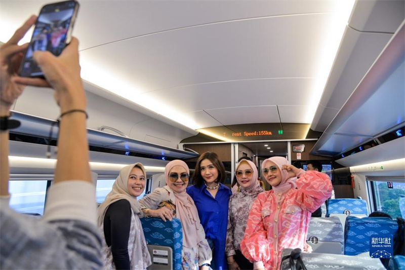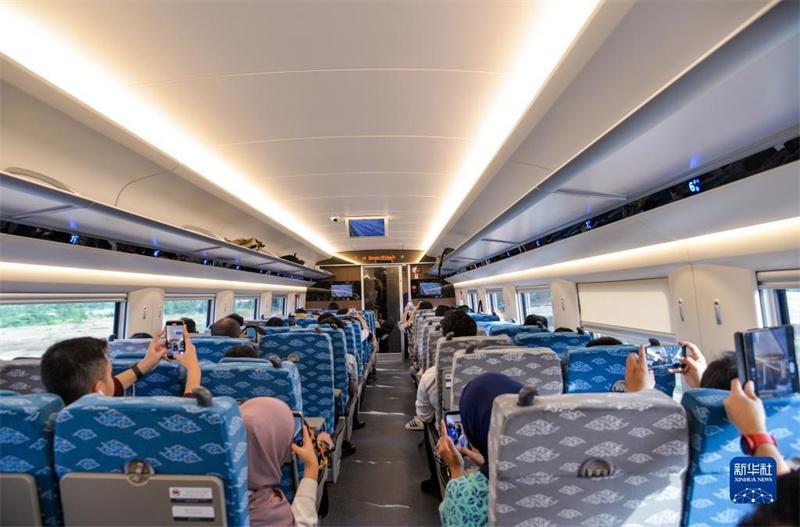 10月17日,乘客在行駛中的雅萬(wàn)高鐵高速動(dòng)車組列車車廂內(nèi)拍照。新華社記者 徐欽 攝