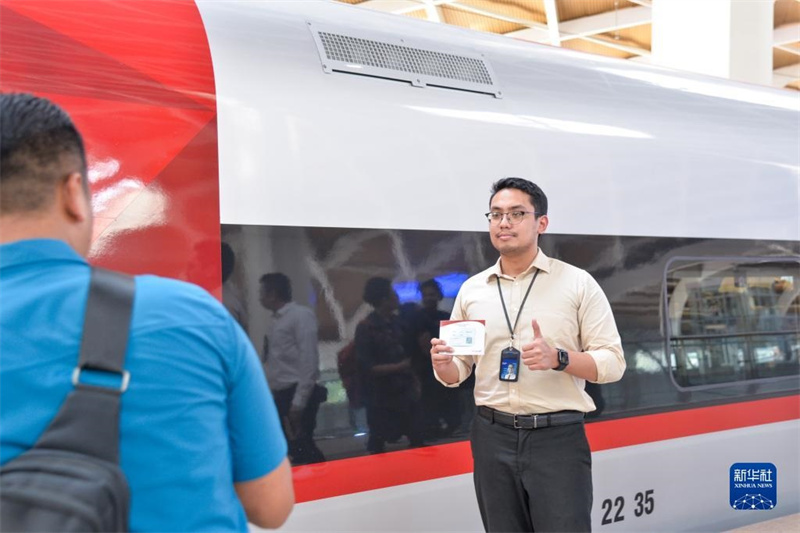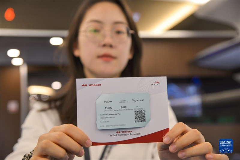 10月17日,乘客在行駛中的雅萬(wàn)高鐵高速動(dòng)車組列車車廂內(nèi)展示紀(jì)念車票。新華社記者 徐欽 攝