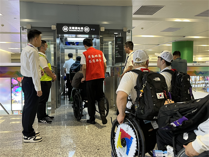 為確保無障礙電梯流暢運轉,杭州蕭山國際機場提前制定專項應急方案,規(guī)劃備用抵達流線,并安排廠家24小時駐點,以便隨時檢修。運動員的輪椅故障也有辦法。機場在到達流線上,設置輪椅及輔助器具維修點,邀請專業(yè)維修師傅“一線駐點”。此外,還在航站樓內配備專用接駁車,布置36處臨時休息區(qū),讓每一位賽事人員都感受到杭州亞殘運會的溫馨周到與熱情好客。