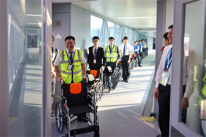 落地前,杭州蕭山國際機場聯(lián)合指揮中心就根據(jù)航班輪椅旅客數(shù)量、廊橋輪椅轉換空間等情況,合理安排??繖C位,同時對無障礙電梯進行專人管控。出艙后,工作人員開啟備用電梯,分流輪椅旅客,在進港各點位安排專人引導與協(xié)助,避免電梯口長時間等待滯留,提升代表團到達效率一倍以上。