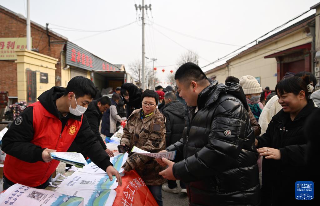 2月4日,天津市武清區(qū)英東泓業(yè)社會工作服務中心的志愿者在太子務大集上發(fā)放倡導文明行為的傳單。