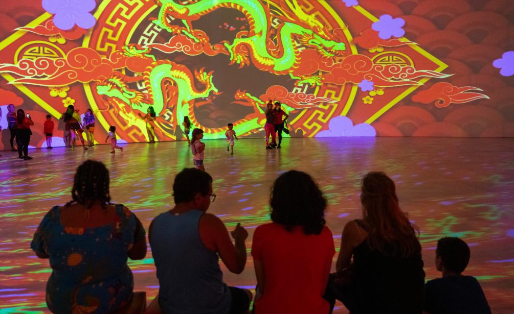 夜幕降臨,燈光秀上演。公園內(nèi)的路易斯門東薩劇院外墻上騰起金色巨龍的燈光秀,龍年拜年娃娃、二十四節(jié)氣隨后展現(xiàn),之后在劇院的舞臺(tái)上來自圣保羅唐韻藝術(shù)團(tuán)的演員們帶來中國特色舞蹈。