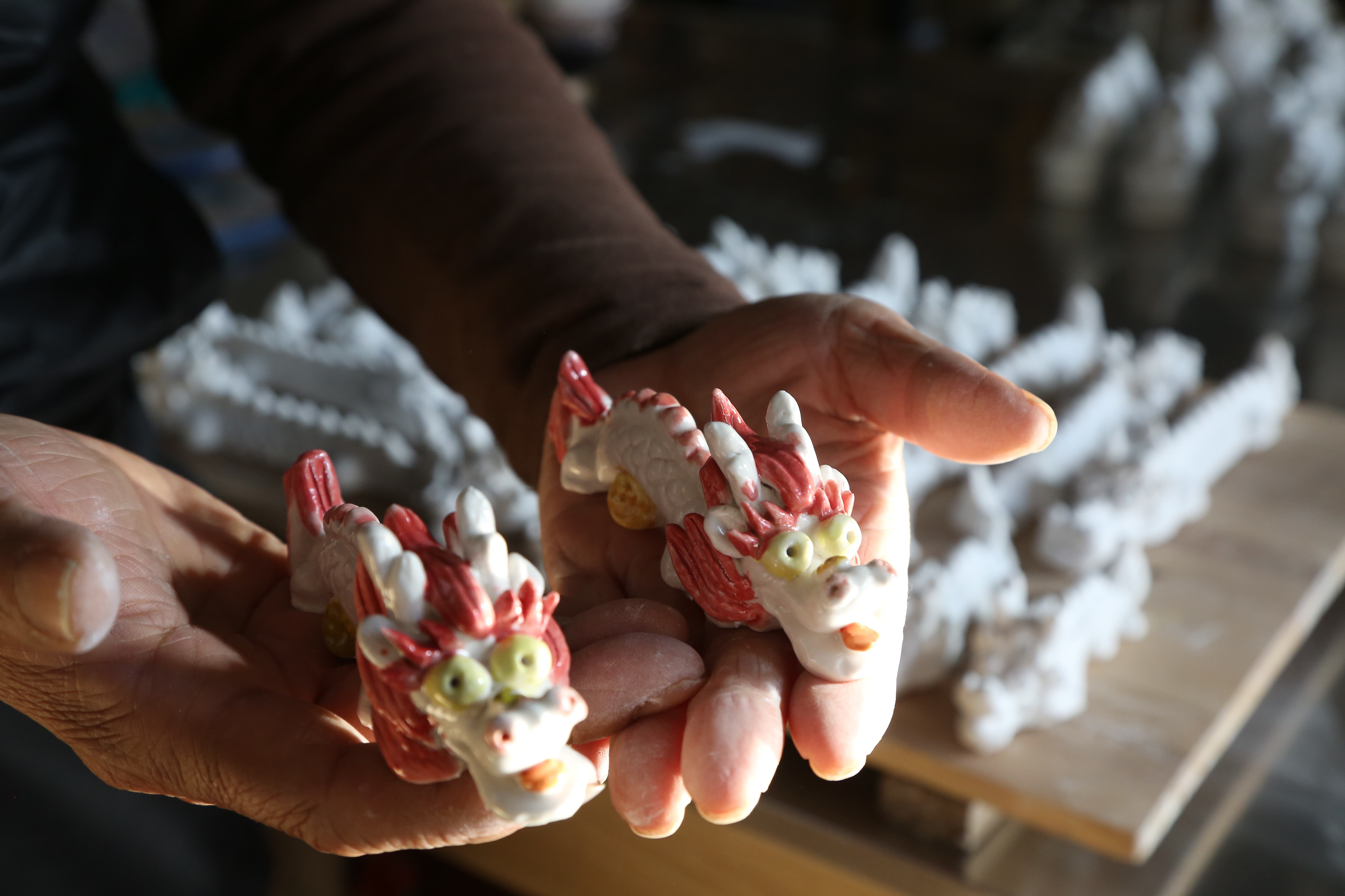 “你看,從龍頭到龍身、龍尾全是昂揚(yáng)向上的姿態(tài),也是希望大家在新的一年發(fā)揚(yáng)龍馬精神,昂首奮進(jìn)。”史月明手里正在創(chuàng)作一個龍筆架泥塑,希望我趕制出來的這批春節(jié)泥塑作品,能為大家增添不少春節(jié)的歡樂氣氛,祝愿大家歡歡喜喜過新年!