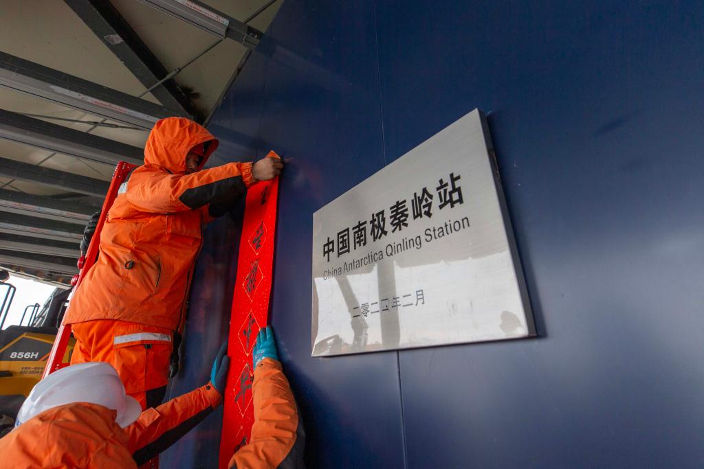 中國(guó)南極秦嶺站,中國(guó)第40次南極考察隊(duì)員正在貼對(duì)聯(lián)。新華社記者周圓 攝