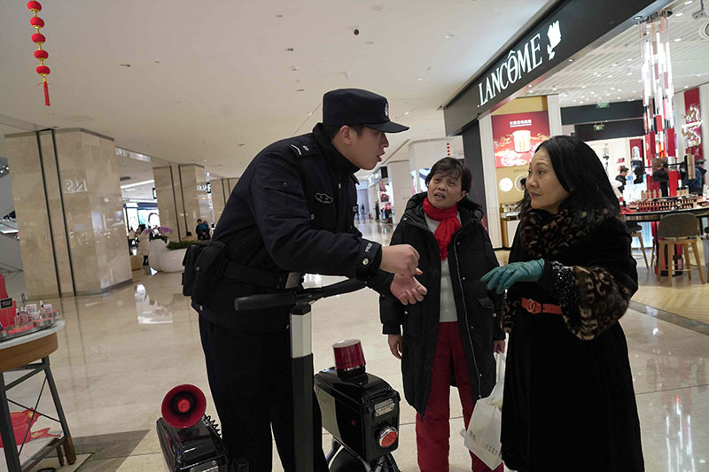 春節(jié)期間,湖北省武漢市公安局武昌區(qū)分局梅苑派出所民警肖楠和同事用心守護武商夢時代廣場的平安。