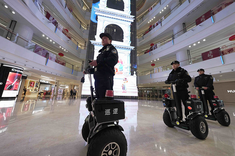 圖為湖北省武漢市公安局武昌區(qū)分局梅苑派出所民警駕駛平衡車在武商夢時代廣場內(nèi)部巡邏。孫遜/攝