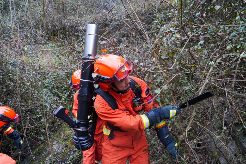 森林消防員利用砍刀開辟前進(jìn)道路。(甘肅省森林消防總隊(duì)供圖)