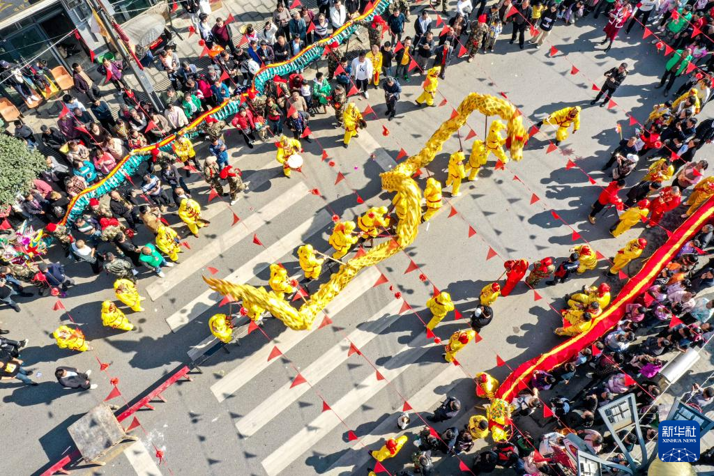 2月20日,舞龍愛好者在貴州省遵義市播州區(qū)三岔鎮(zhèn)集鎮(zhèn)街參加舞龍爭霸賽表演(無人機照片)。