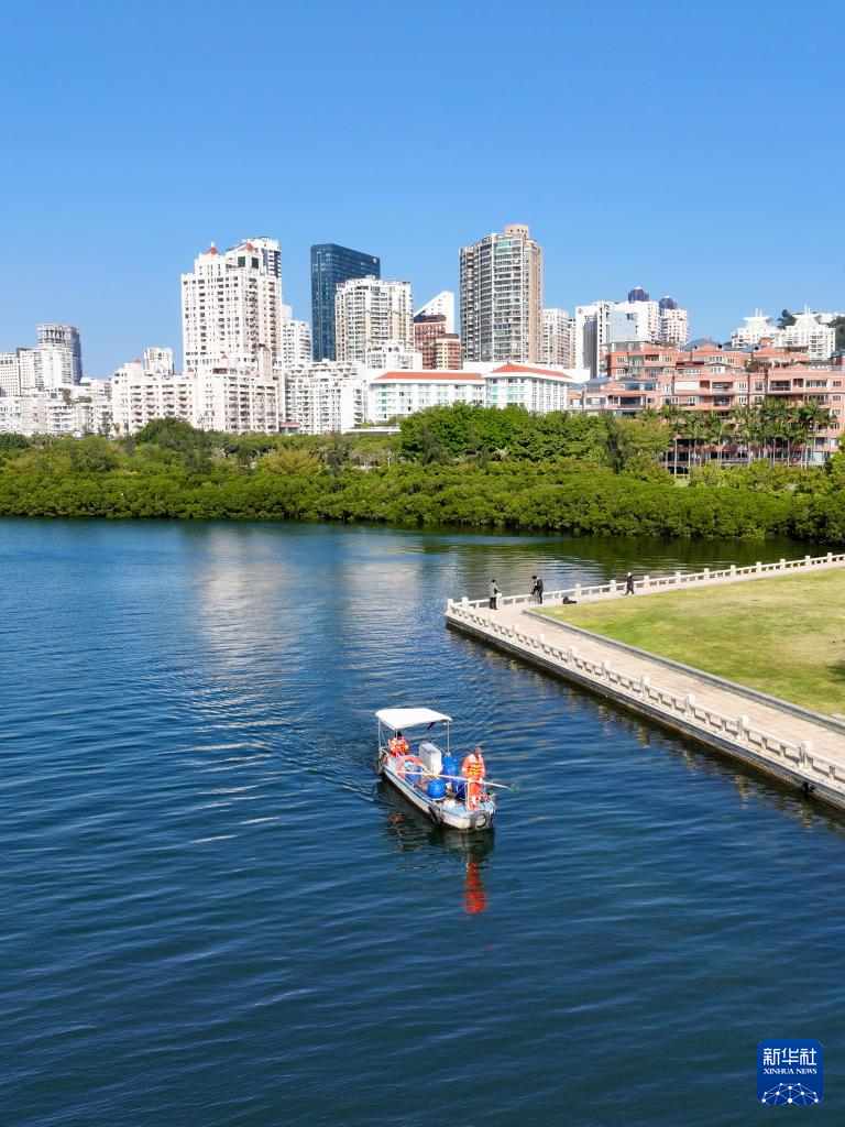 1月24日,一艘環(huán)衛(wèi)船行駛在廈門筼筜湖湖面上(無人機照片)。新華社記者 姜克紅 攝