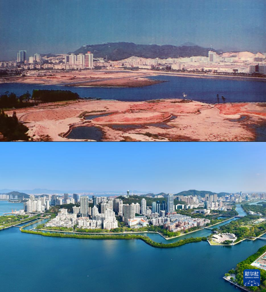 拼版照片:上圖為20世紀80年代拍攝的筼筜湖(資料照片);下圖為2024年1月24日拍攝的廈門筼筜湖及周邊城市景觀(新華社記者姜克紅攝,無人機照片)。