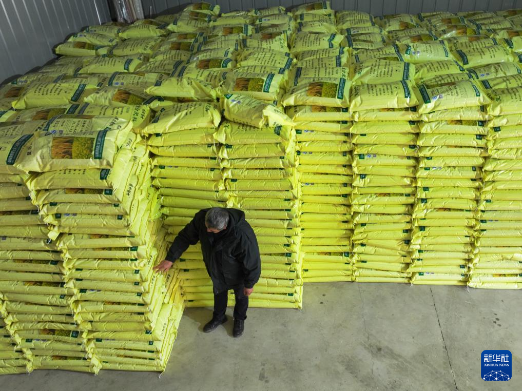 2月25日,在湖南省益陽市赫山區(qū)農田謀士水稻專業(yè)合作社,工作人員在查看復合肥料儲備情況(無人機照片)。