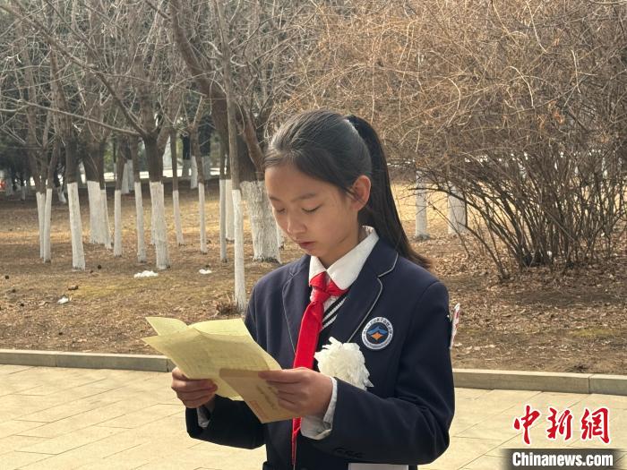 沈陽(yáng)市寧山路小學(xué)學(xué)生在烈士墓碑前朗讀信件。李伶俐 攝