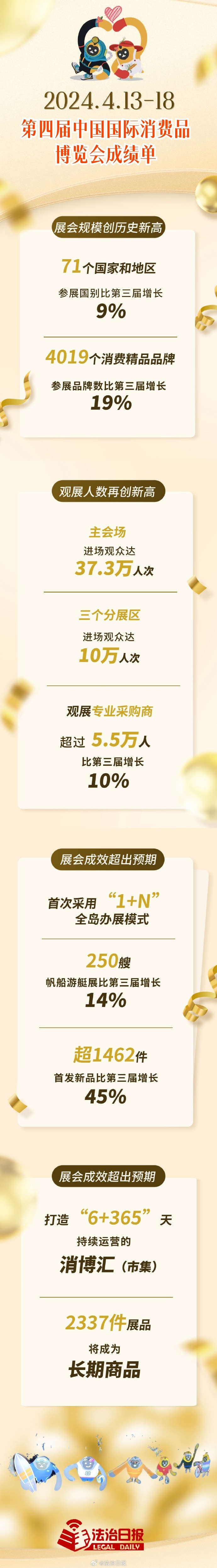 為期6天的第四屆中國(guó)國(guó)際消費(fèi)品博覽會(huì)于4月18日順利閉幕。6天48萬人,超1400件新品首發(fā)……閉幕會(huì)當(dāng)天下午,消博會(huì)曬出了亮麗的成績(jī)單,一起查收吧。(法治日?qǐng)?bào)全媒體記者 朱雨晨 趙暖芷)