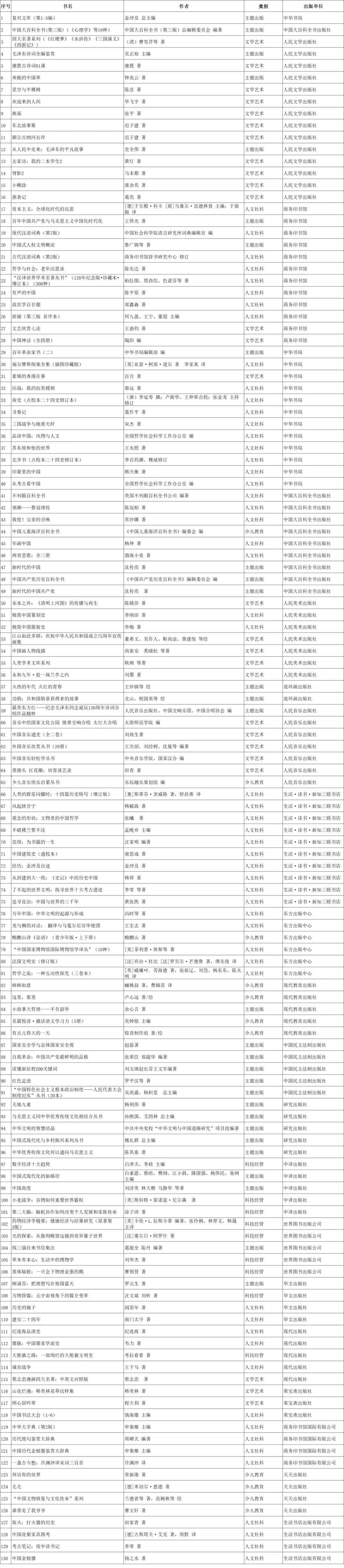 “中國出版集團(tuán)2024年全民閱讀書單”,共130種精品。其中,主題出版類29種,人文社科類54種,文學(xué)藝術(shù)類27種,科技經(jīng)管類9種,少兒教育類11種。既有《復(fù)興文庫》《中國大百科全書(第三版)》等重磅產(chǎn)品,也有“漢譯世界學(xué)術(shù)名著叢書”等暢銷精品;既有《星空與半棵樹》等獲獎作品,也有《誰帶走了我爺爺》等少兒新作。