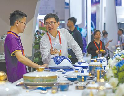 中國國際消費品博覽會成為引領(lǐng)消費時尚和促進消費轉(zhuǎn)型升級的重要平臺,吸引了全球眾多優(yōu)質(zhì)品牌前來參展。圖為消博會全球特色消費展區(qū)景德鎮(zhèn)展臺。