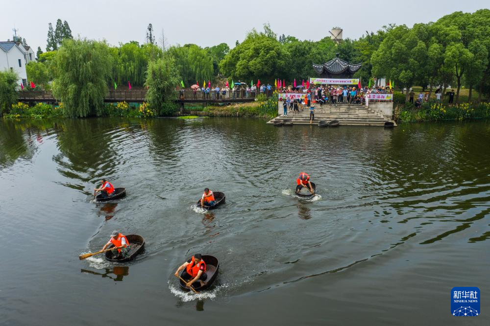5月25日,村民們參加水鄉(xiāng)劃菱桶比賽。菱桶是河網(wǎng)密布的東林鎮(zhèn)百姓家中常見的一種傳統(tǒng)水上勞動(dòng)工具,村民在捕魚、采菱、采荷時(shí)都要用到(無人機(jī)照片)。