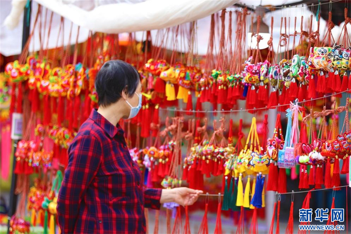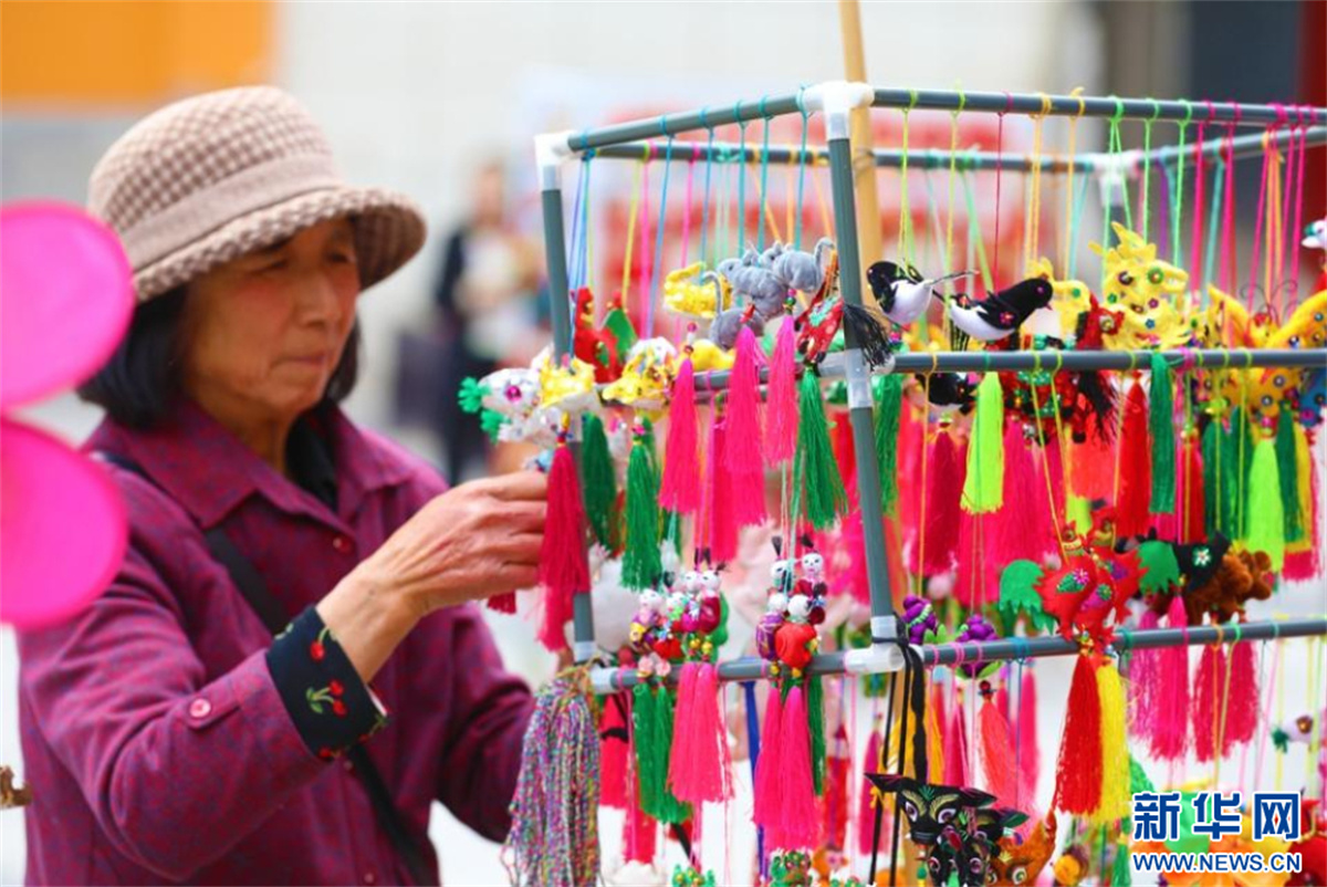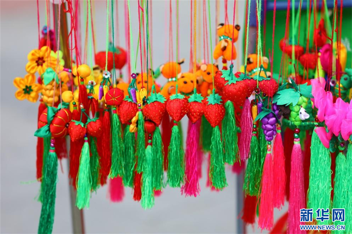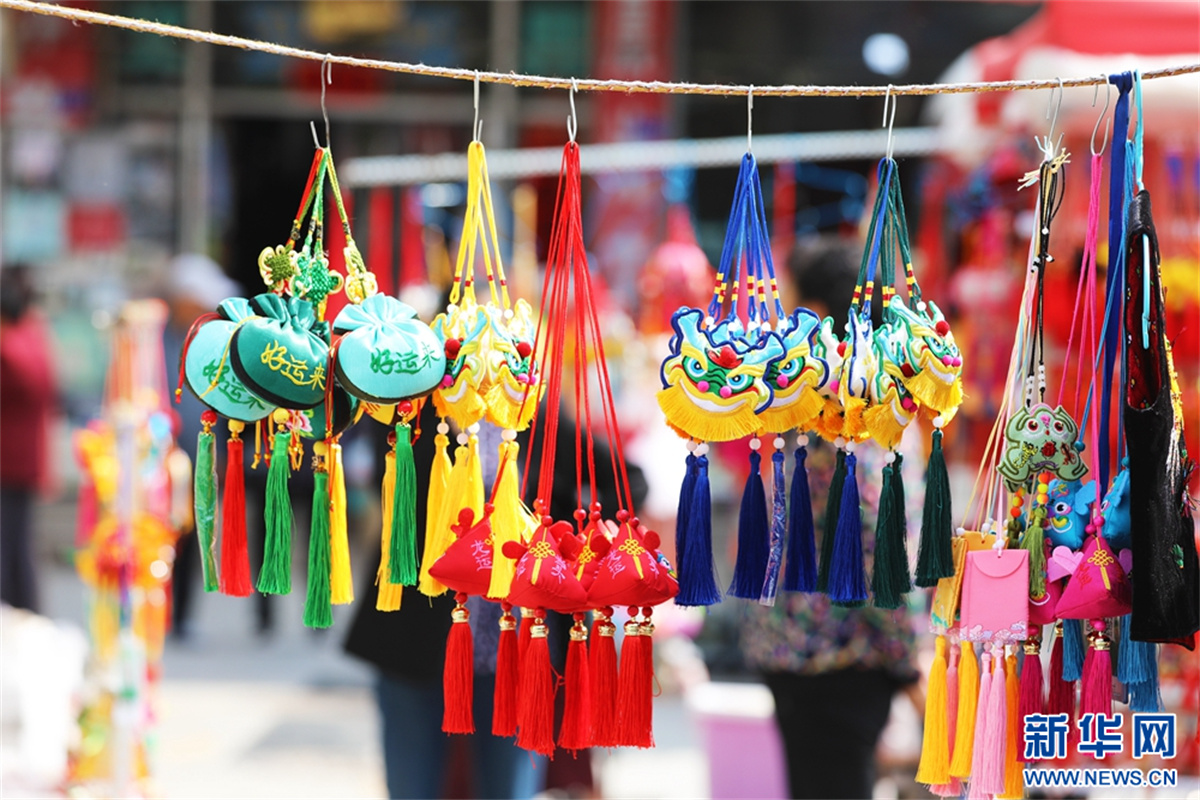 端午節(jié)臨近,甘肅省平涼市中心城區(qū)的攤位上掛滿了各式各樣的香包、手鏈等,色彩斑斕、醇香撲鼻,吸引不少市民前來選購。新華網發(fā)(祁秋謹 王靖樂 攝)