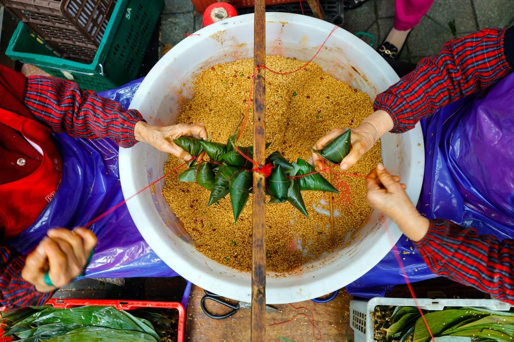 6月7日,在四川省成都市的“粽子一條街”上,一家粽子店的工作人員在包粽子。新華社記者 沈伯韓 攝