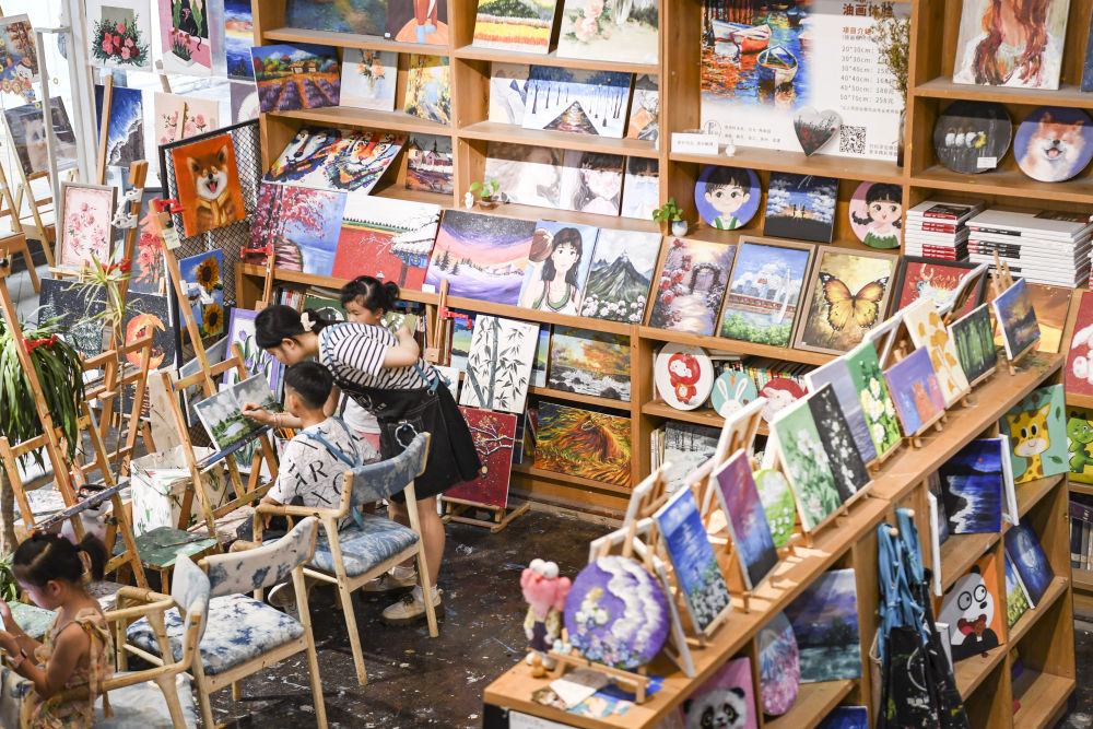 ↑7月15日,游客在重慶市江北區(qū)北倉文創(chuàng)街區(qū)體驗(yàn)繪畫。