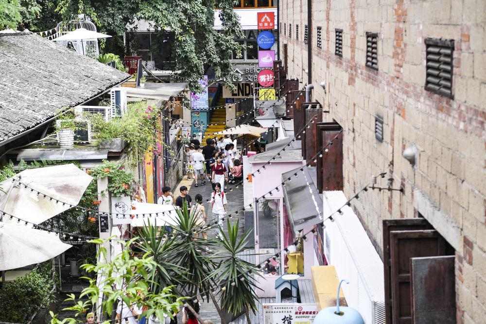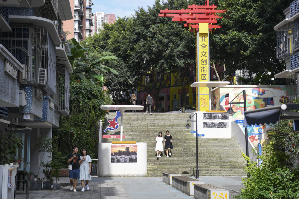 ↑7月15日,游客在重慶市江北區(qū)五里店街道鶯花巷合作村青年國際社區(qū)游覽、拍照。