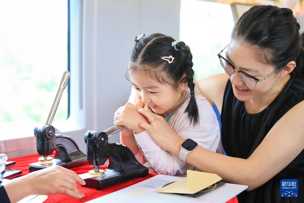 8月8日,在G132次列車(chē)上,家長(zhǎng)和孩子一起體驗(yàn)鋼印制作書(shū)簽。