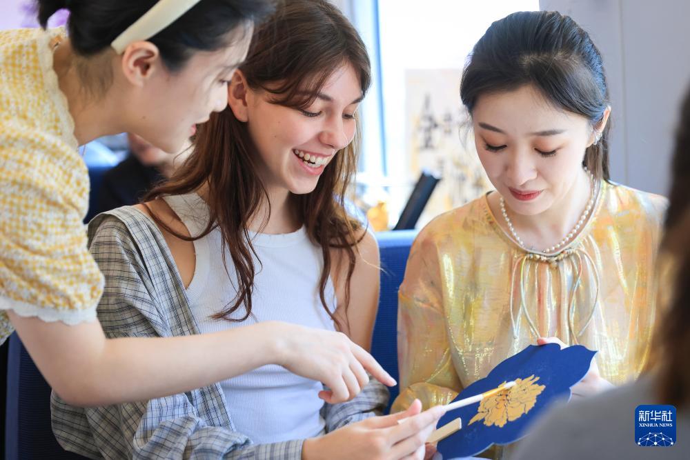 8月8日,在G7393次列車(chē)上,一名外國(guó)旅客體驗(yàn)制作金箔扇。