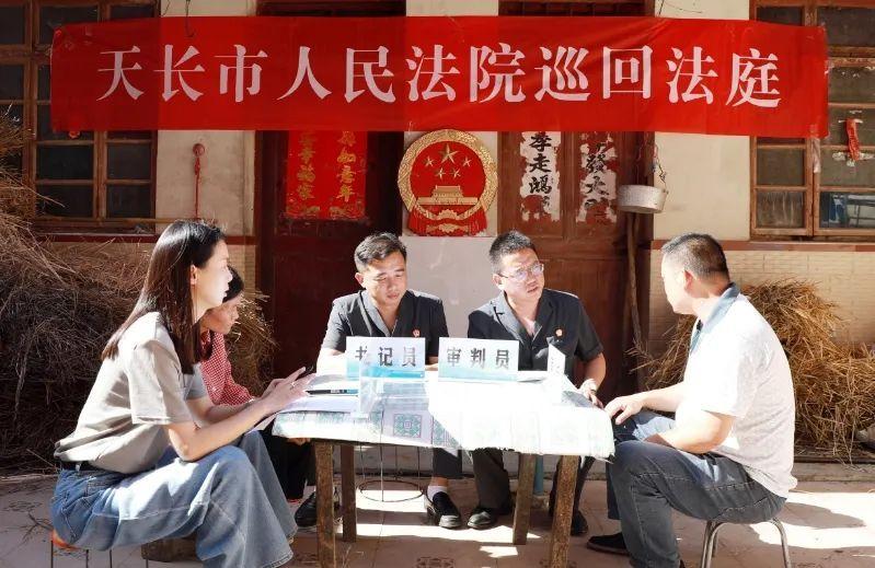 圖為安徽省天長(zhǎng)市人民法院銅城人民法庭法官劉緒凱(右二)下鄉(xiāng)調(diào)解案件。