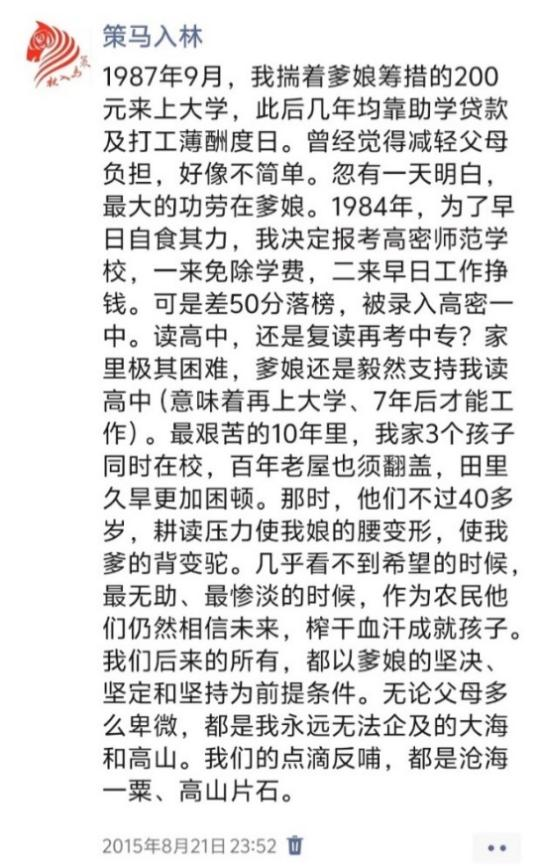 2015年8月21日微信朋友圈帖文,此帖點贊評論互動量500多次。